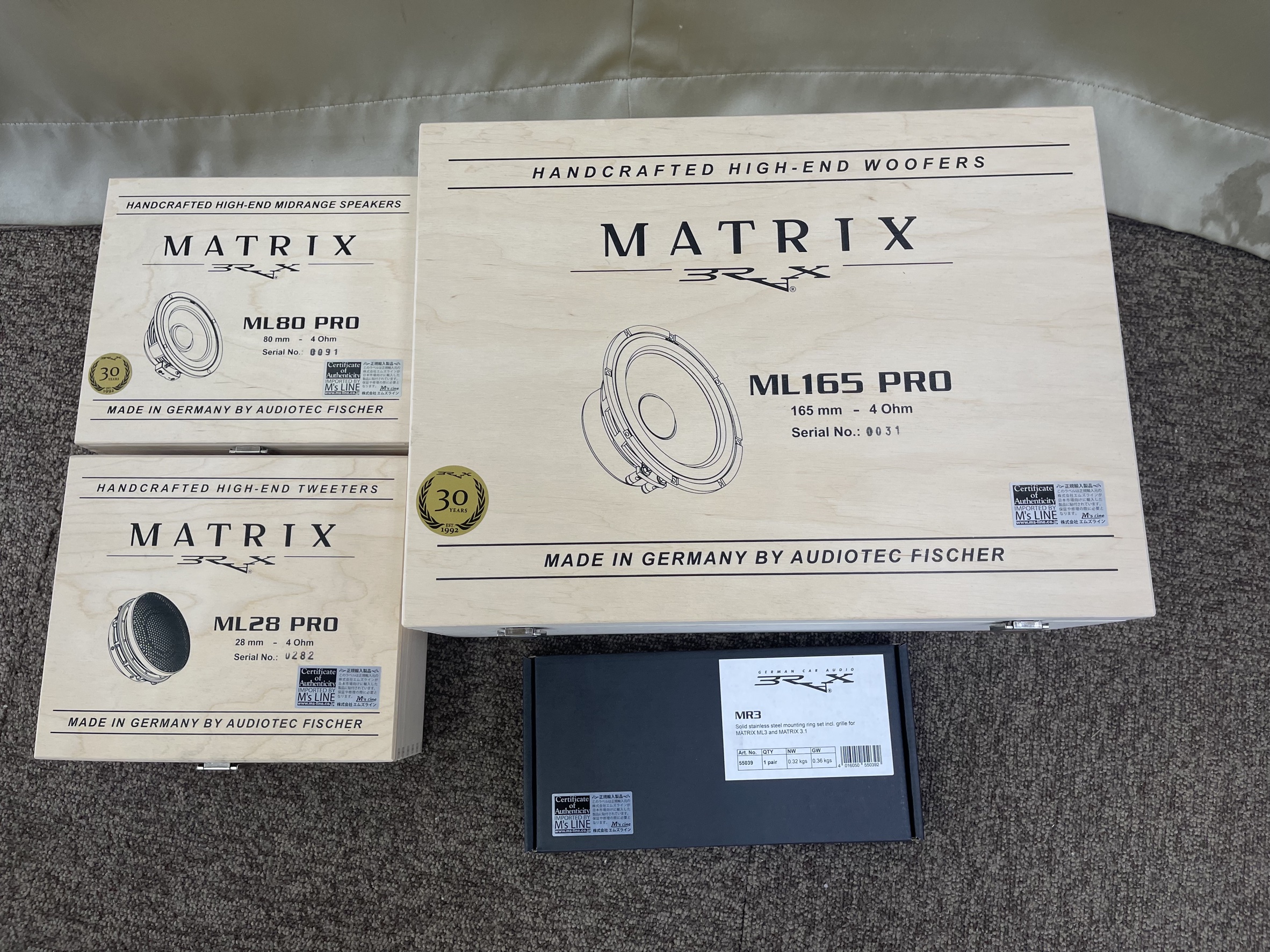 今回は、MATRIX ML28 PROトゥイーター 税込231,000円、MATRIX ML80 PRO ミッドレンジ 税込 231,000円、MATRIX ML165 PRO ミッドウーファー 税込 352,000円のフロント3WAYの構成になります。